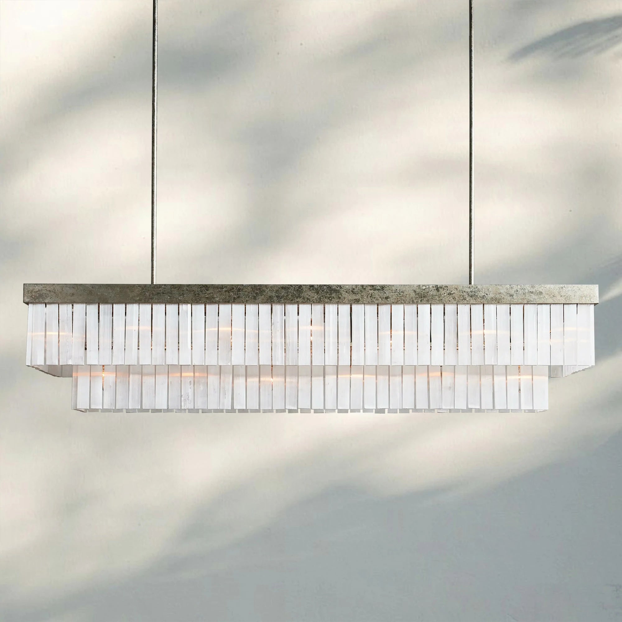 Adorned with natural selenite crystals, our Cameron Lighting Collection reflects light as they hang elegantly beneath the iron frame. An antiqued silver finish is hand-brushed by our artisans, creating a glamorous aesthetic.