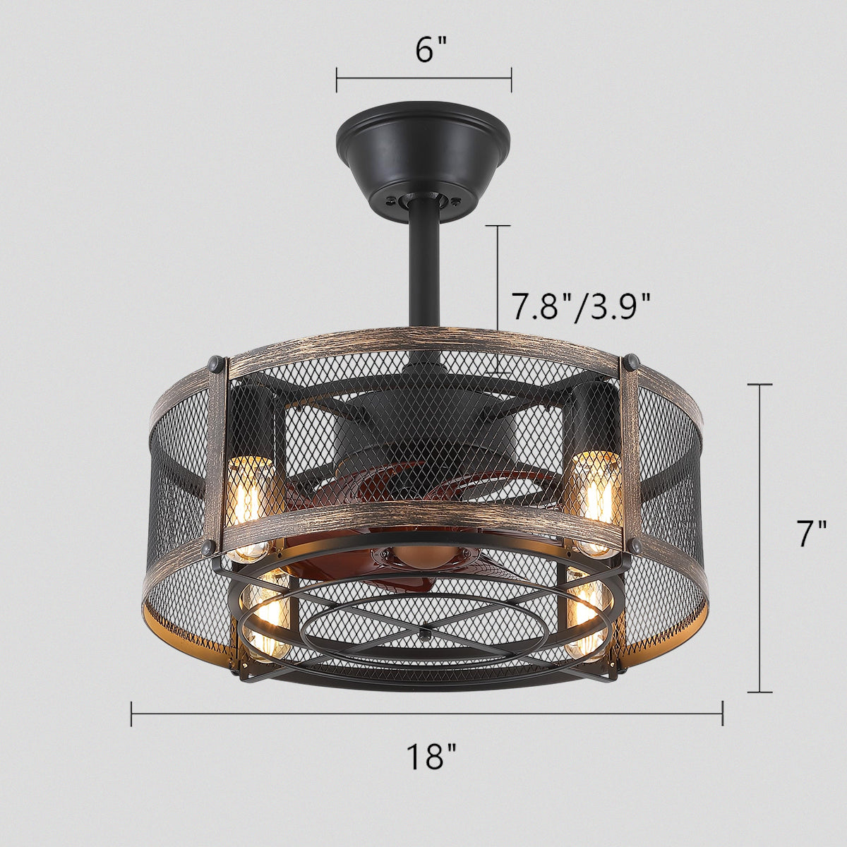 Farmhouse cage ceiling fan: Stylish indoor cage farmhouse ceiling fan with light, Contemporary wood grain open-frame cage and rhombus grid design