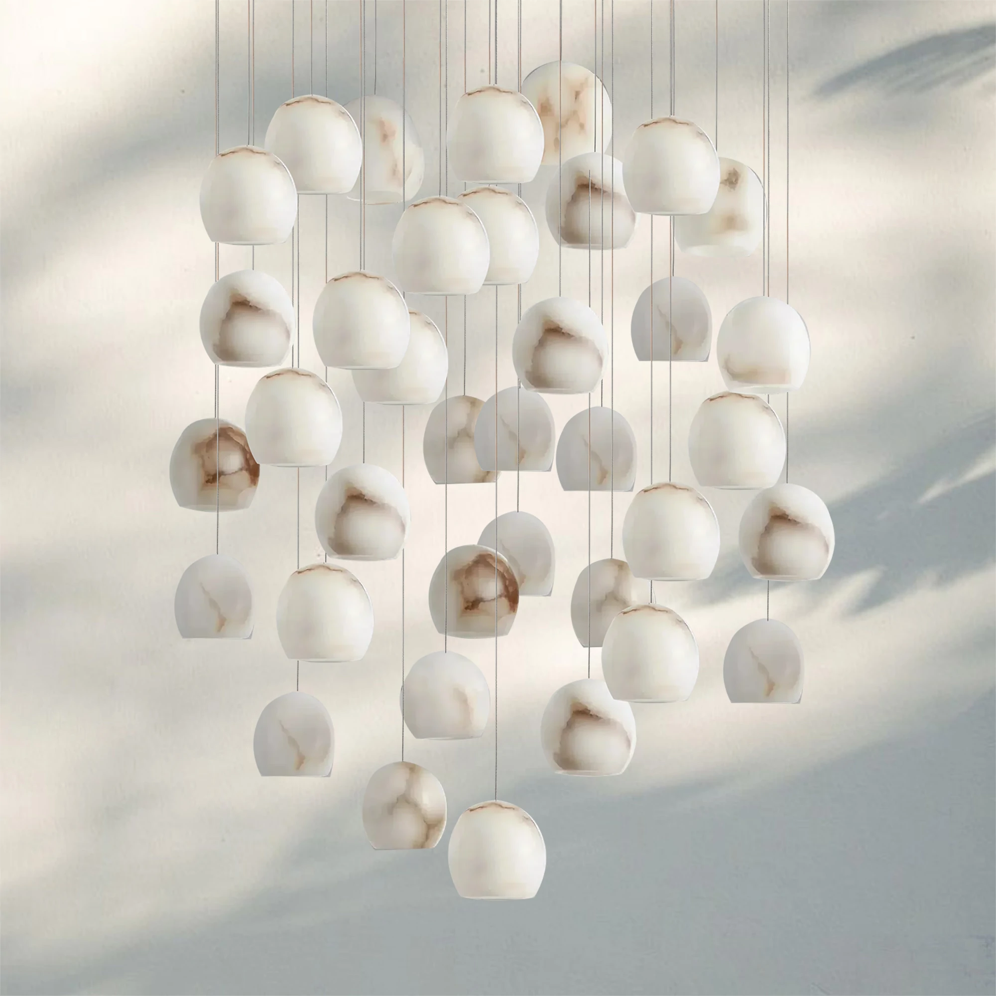 Featuring an adjustable cable cascading into a curved shade made from natural alabaster stone, our Arica Collection adds a touch of organic elegance. Designed to highlight the beautiful variations found in natural alabaster, each luminous shade showcases delicate swirls of unique veining making each pendant truly one-of-a-kind.