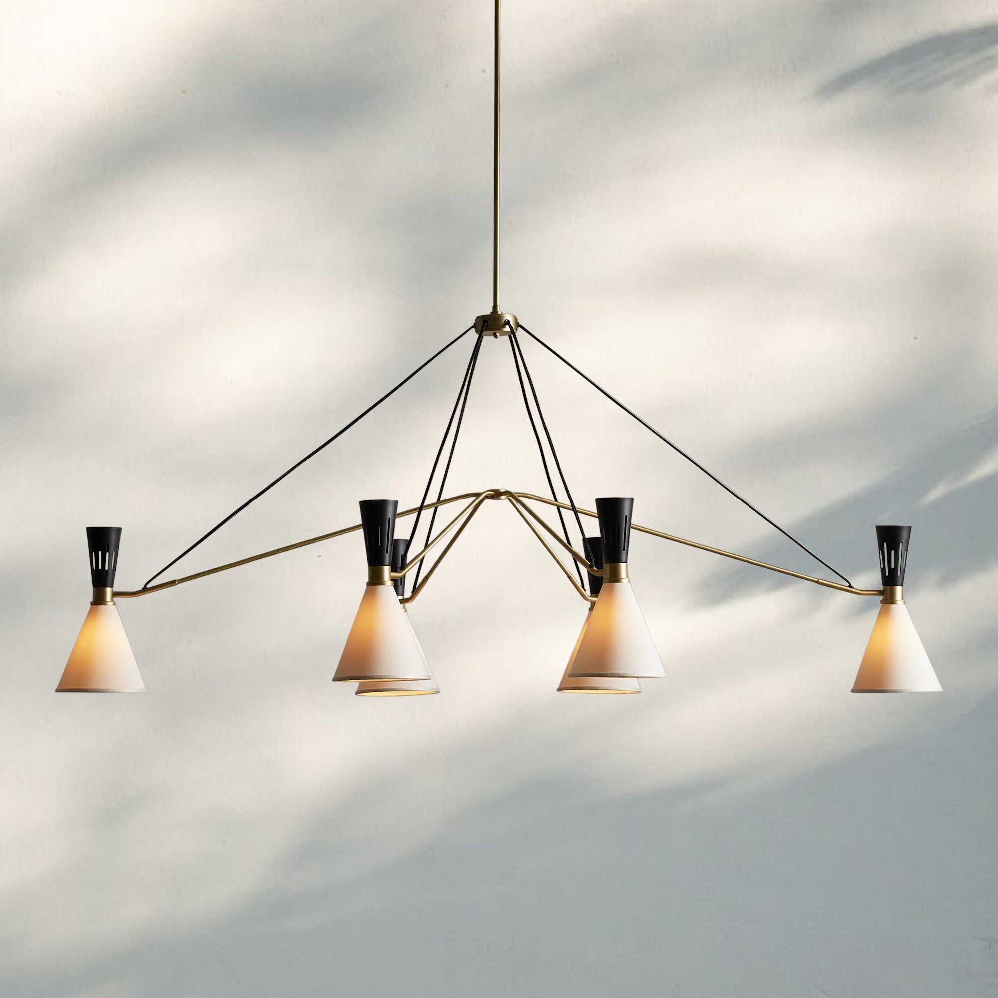 Inspired by an antique found in a Parisian flea market, our Ramsey Lighting Collection boasts a mid-century Italian sculptural silhouette. Hand-crafted by artisans in northern Italy, Ramsey features exposed, black-fabric cord supporting a beautiful brass frame. The fabric shades add the perfect contrast in texture emitting a soft, warm glow.