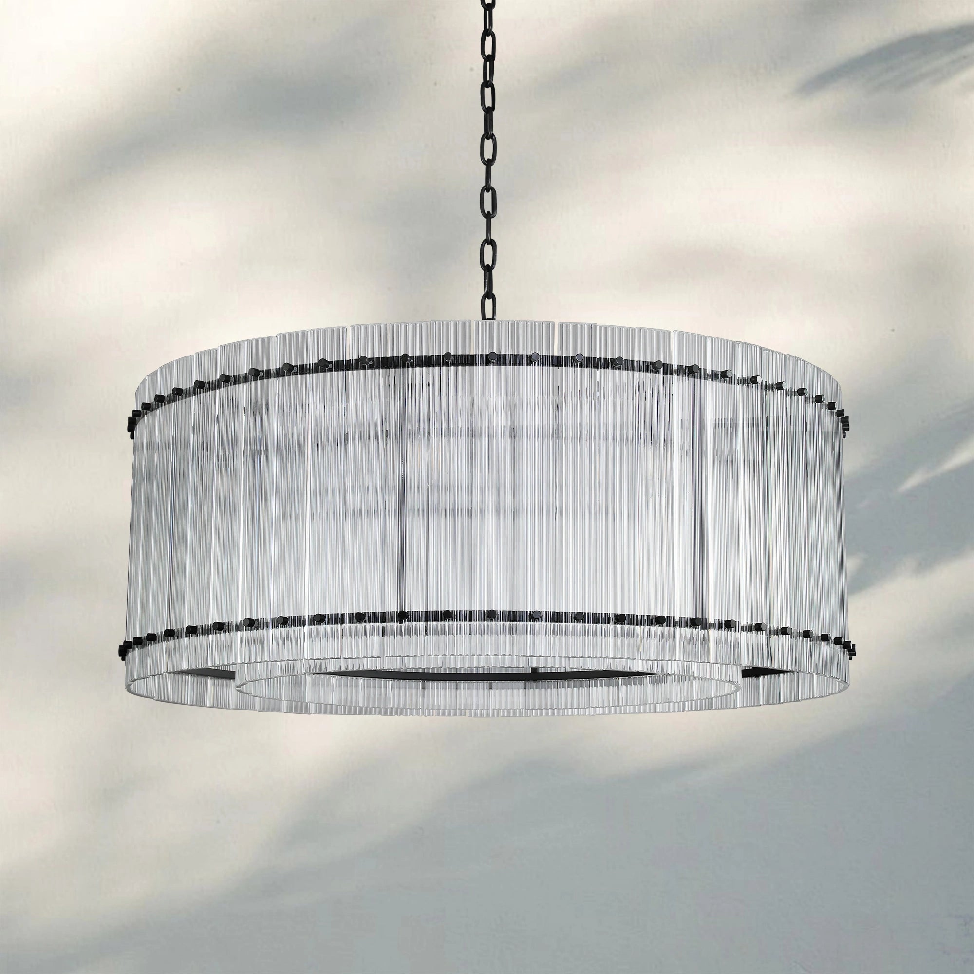 - Crafted of handmade fluted glass panels on a steel frame