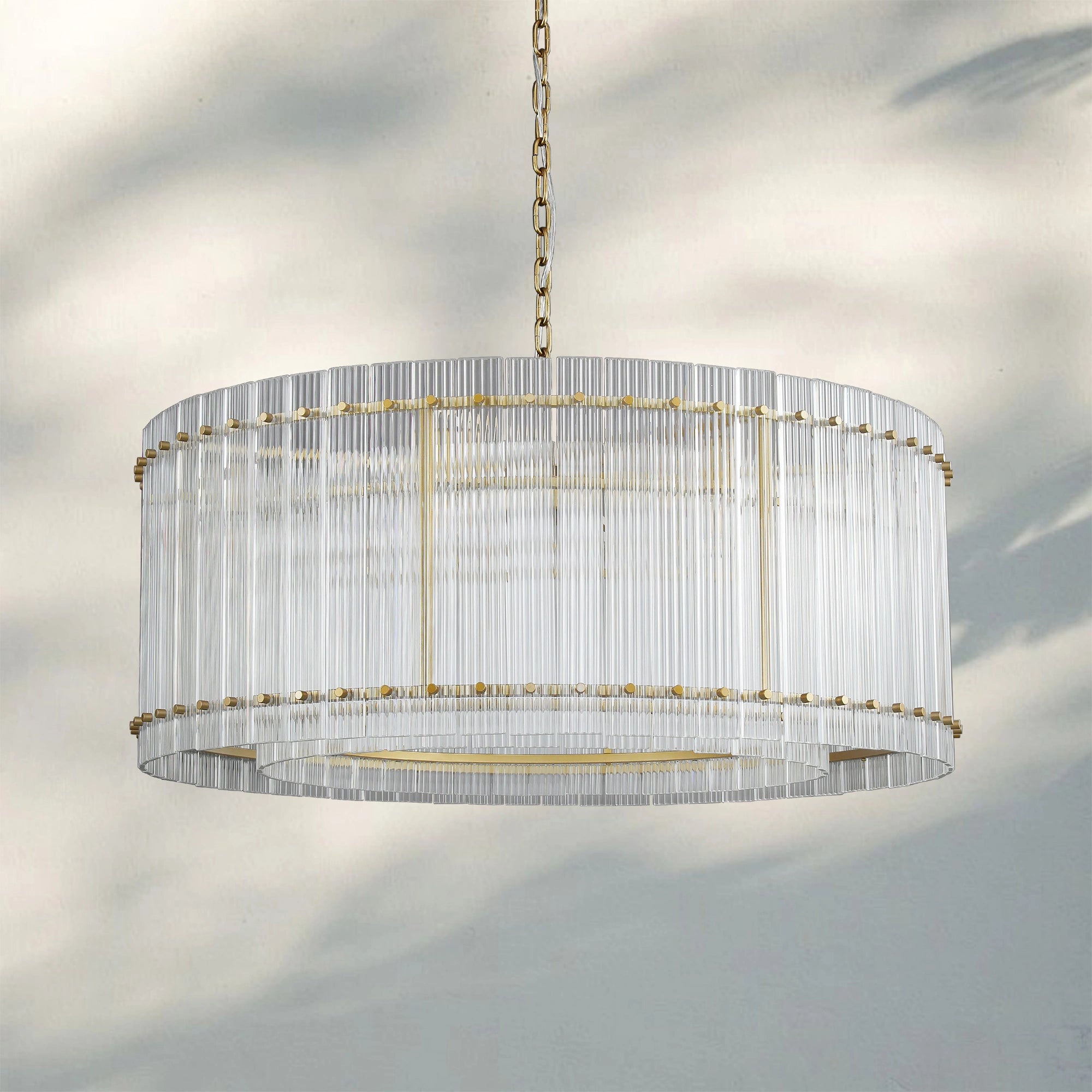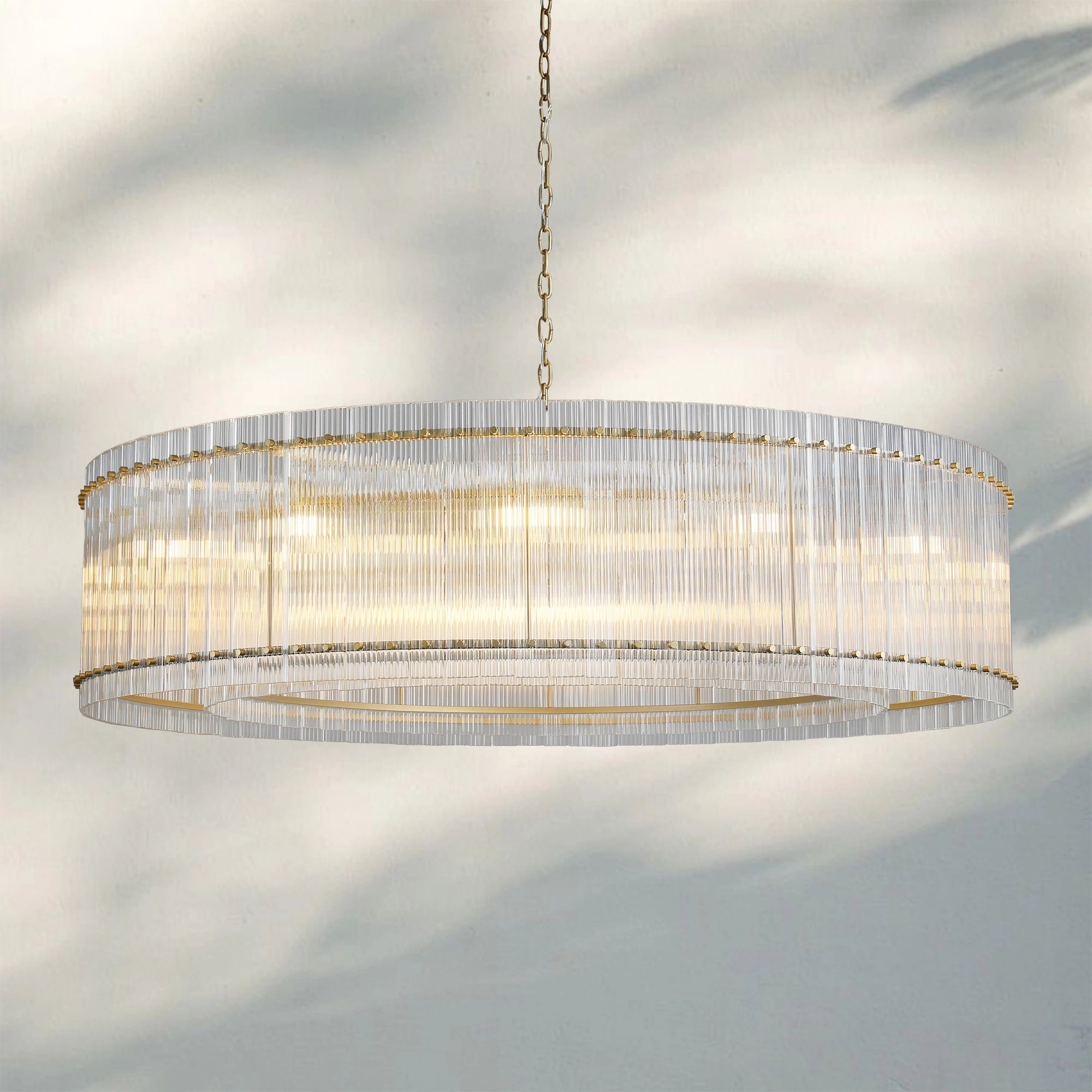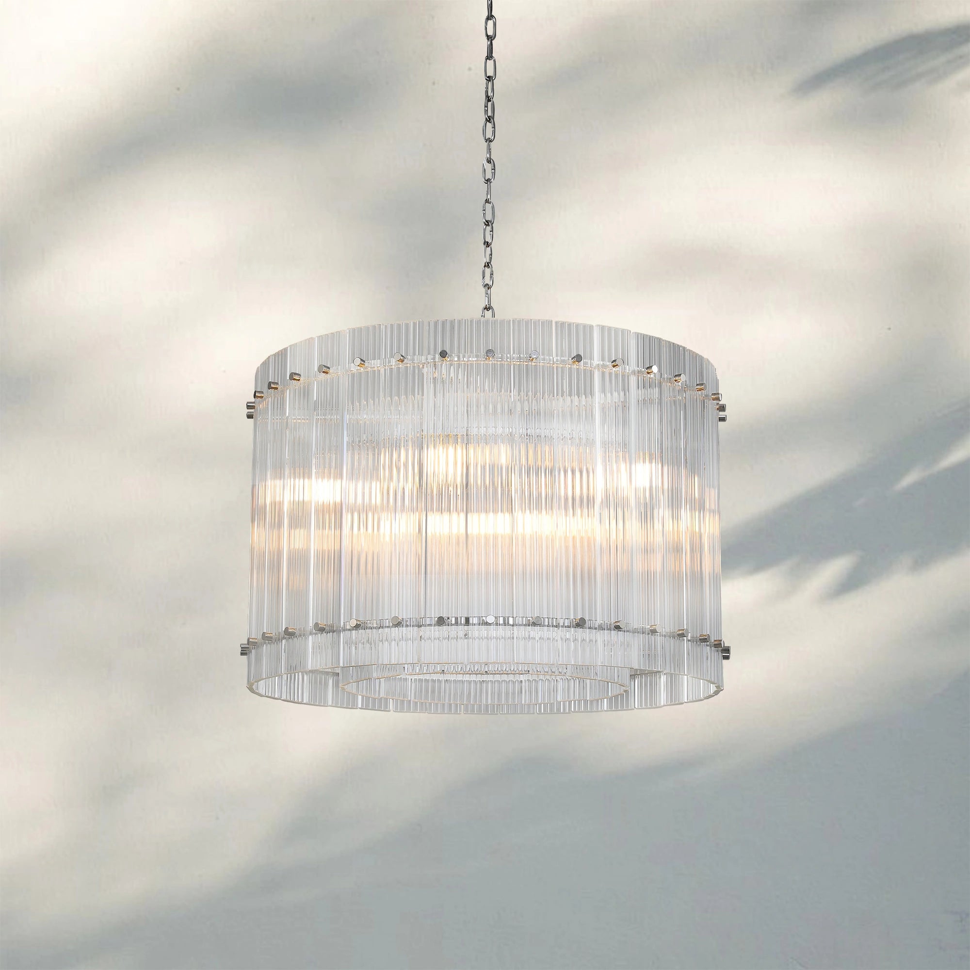 Our Branchchandelier fixture captures the timeless elegance of mid-century Italian glass design. Encased in a refined metal frame, each hand-crafted glass pane features a delicate fluted texture, casting a captivating interplay of light and a warm, diffused glow.