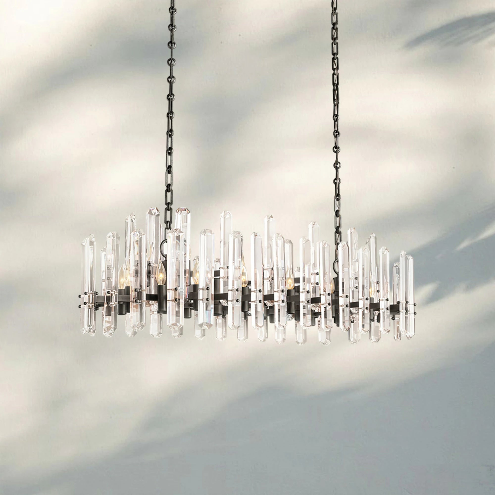 The Bonington Collection chandelier features multi-layered, highly faceted crystals that bring light and luxury to your living space. The rugged, industrial-style frame gives the fixture a concentric shape that complements the sophisticated and elegant look. Light is generated by a dozen light sources located behind the crystal, which are refracted for a dazzling effect.