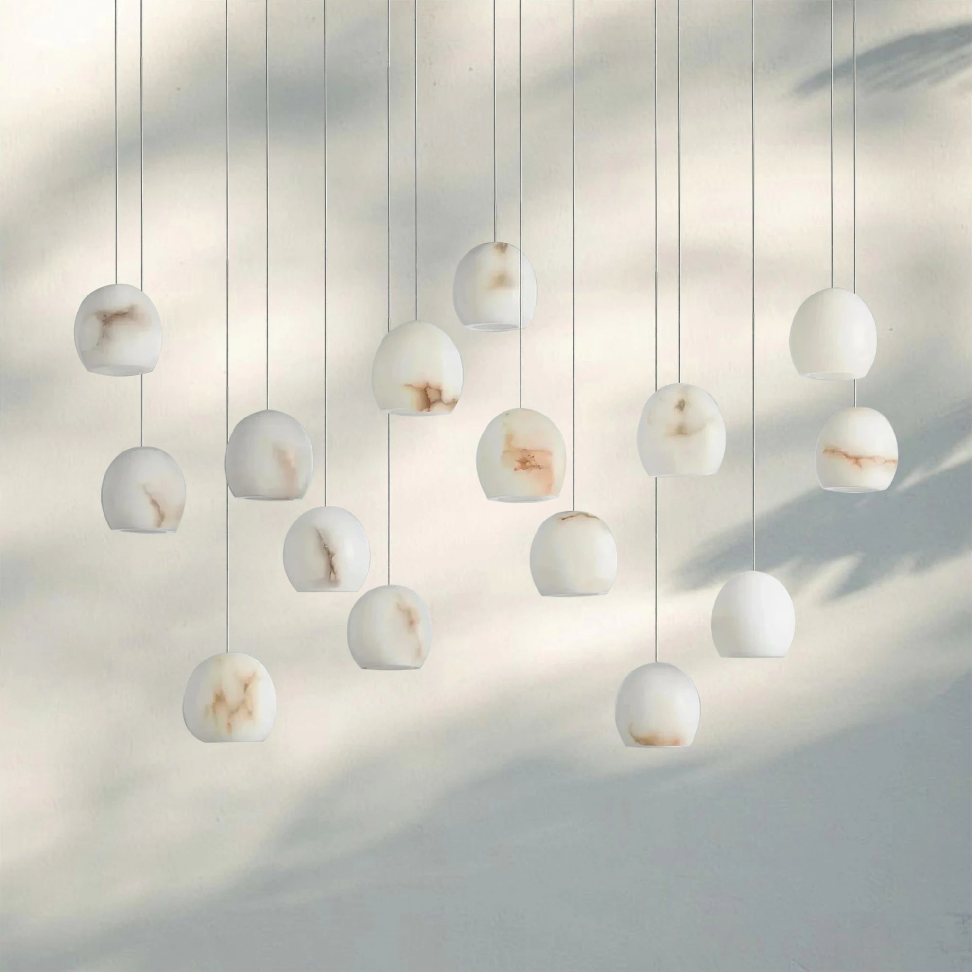 Featuring an adjustable cable cascading into a curved shade made from natural alabaster stone, our Arica Collection adds a touch of organic elegance. Designed to highlight the beautiful variations found in natural alabaster, each luminous shade showcases delicate swirls of unique veining making each pendant truly one-of-a-kind.