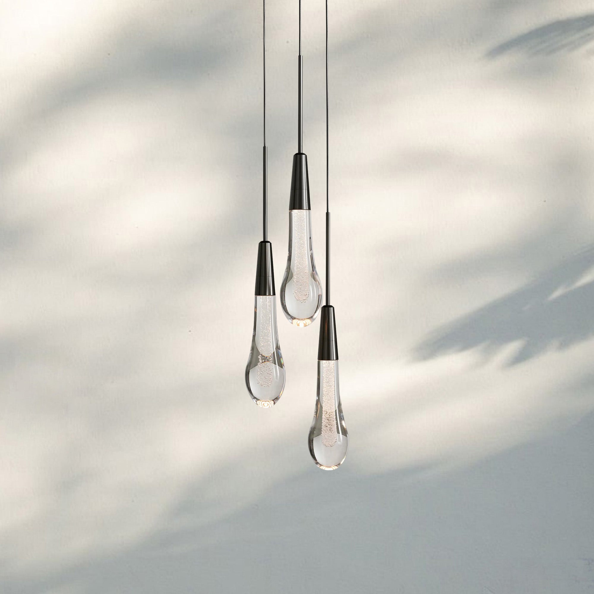 Featuring adjustable black PVC cords cascading into integrated LED lights handcrafted from seeded glass, our Soltaire Lighting Collection mimics the look of a fallen raindrop.