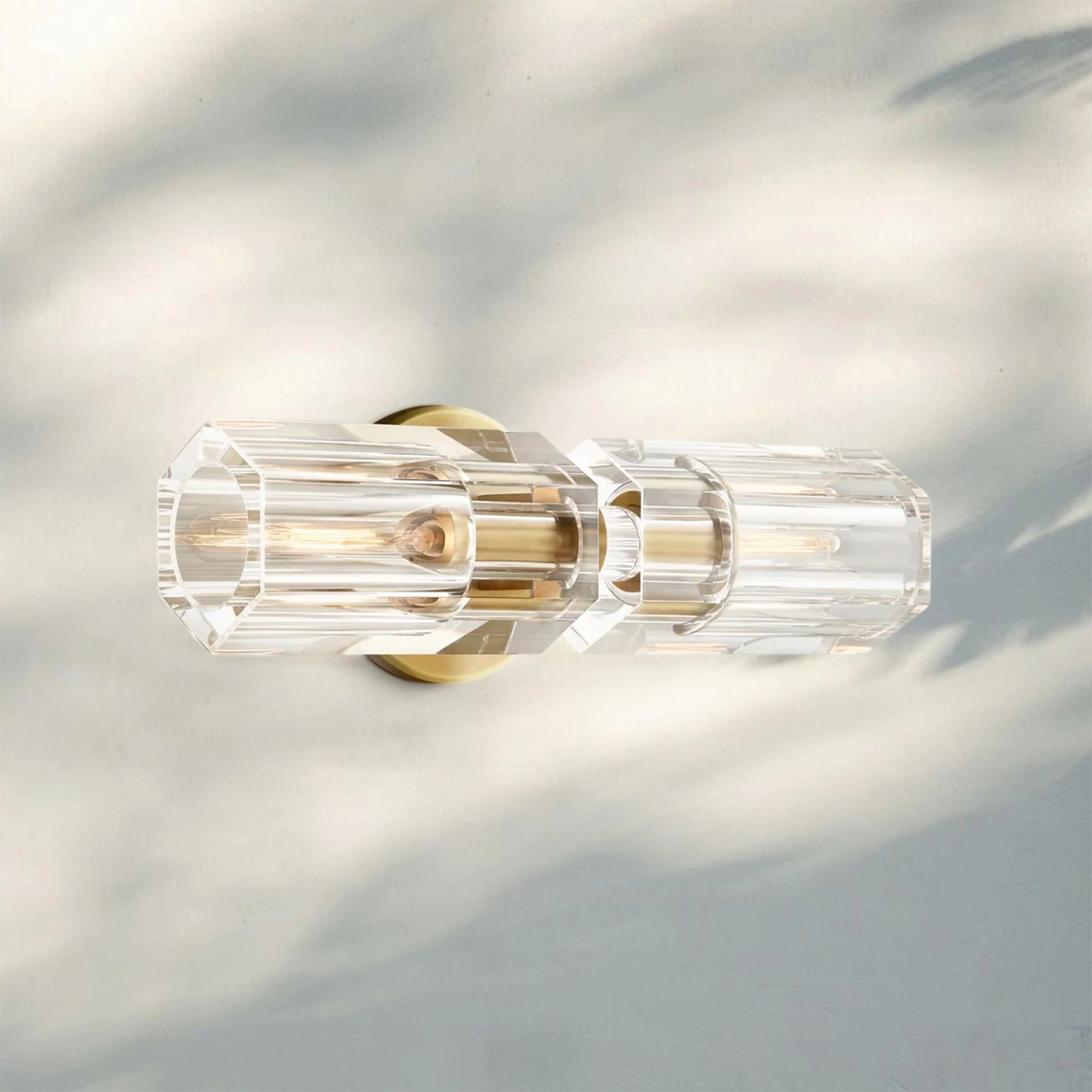 The collection is inspired by the shape and scale of industrial gears, where spokes intersperse with negative space in order to interlock with other gears. Here, the spokes are hexagonal forms juxtaposed with rounded interiors, beautifully crafted of crystal glass, running along a simple, solid metal frame.