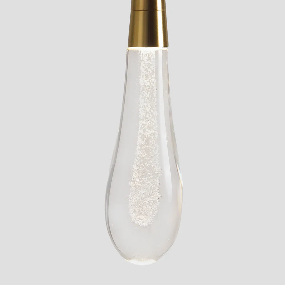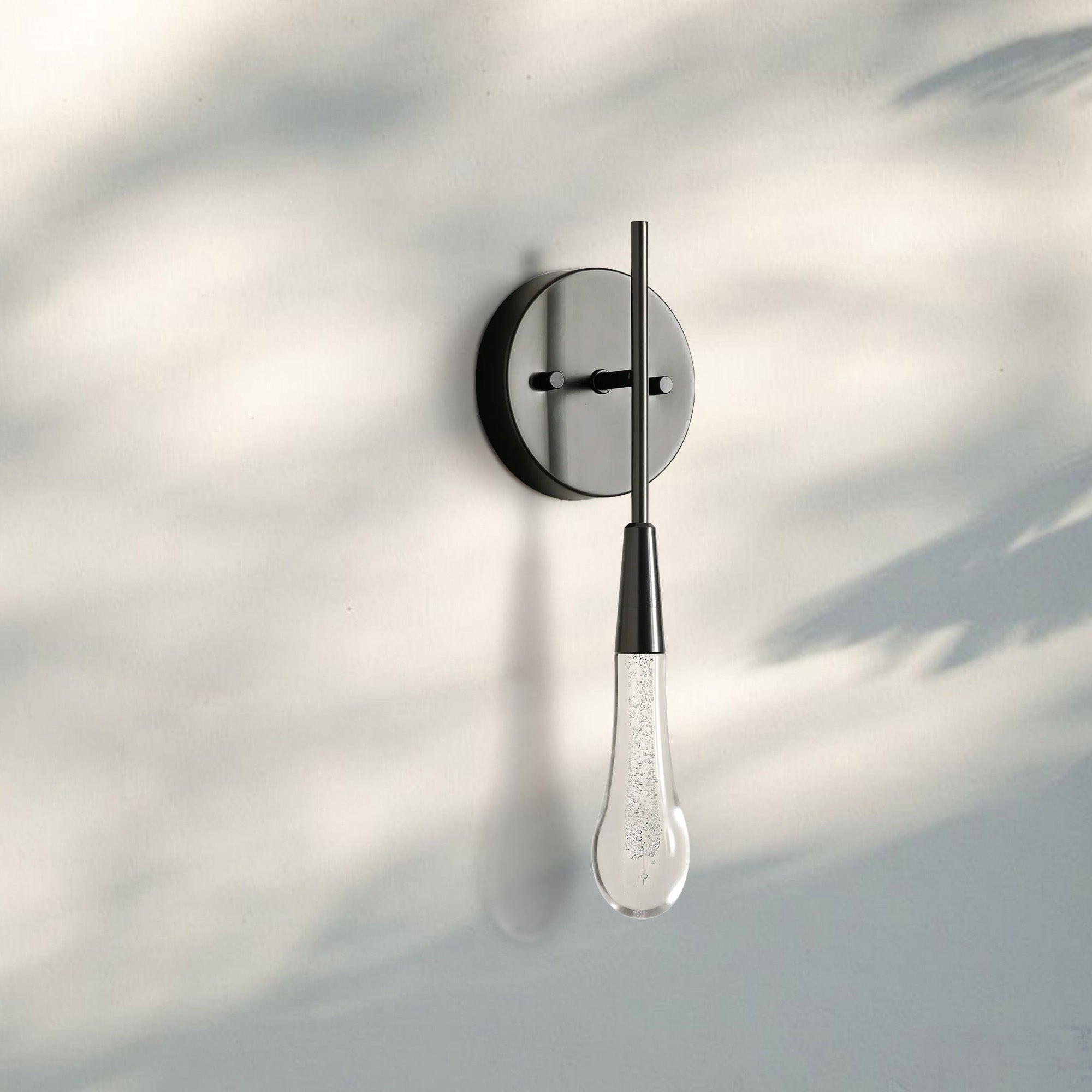 Featuring a sleek metal arm cascading into an integrated LED light handcrafted from seeded glass, our Soltaire Wall Sconce mimics the look of a fallen raindrop.