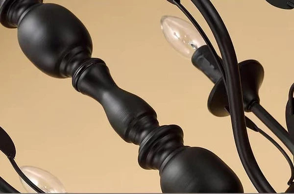 Made of iron, this rustic chandelier features a layered design with candle-like bulb stems with small saucer cups placed on a simple curved iron arm. As a home decor, it is full of nostalgic tones. A few branches are trimmed with leaves at the end for a delicate accent. The handmade durable iron stand in black adds a vintage element to it, taking you back to the mid-century era. It is absolutely stunning whether the lights are on or off and is ideal for a study, living/dining room or some commercial areas including vintage cafes, themed restaurants, etc.